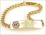 14k Gold-filled bracelet with enamel medical logo to get immediate attention when it's needed most. AVAILABLE IN 2 SIZES WITH UP TO 3 LINES OF JEWELRY-STYLE ENGRAVING. SMALL IS 5/16 INCH WIDE BY 1 & 9/16 INCH LONG WITH A 7.5 INCH CHAIN, LARGE IS 1/2 INCH WIDE BY 1 & 3/4 INCH LONG WITH AN 8.5 INCH CHAIN. Note: Actual items shipped will have the lobster claw style closure instead of pictured closure.Our medical jewelry is the ideal way to provide emergency medical personnel with the information they need to determine the best treatment for you - immediately. First responders are trained to look for medical ID to determine if you have a medical condition or dangerous allergies and if you take any critical medications. And, by including emergency contact information on your ID, you can be sure that loved ones will be notified promptly.