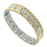 This is a new stylish two-tone stainless steel magnetic link bracelet. Magnetic energy has been trusted to relieve pain and promote healing for thousands of years. The wonders of this power are harnessed by this truly unique 24K gold-plated bracelet precisely engineered from premium grade 316L stainless steel with STAINLESS STEEL STAMPED and 17pcs of 3000+ Gauss permanent north facing magnets. Professional athletes look to magnetic therapy to increase energy, relieve pain and improve circulation. Tarnish-resistant with distinctive gold and silver link design and precision-crafted clasp.Our Price :